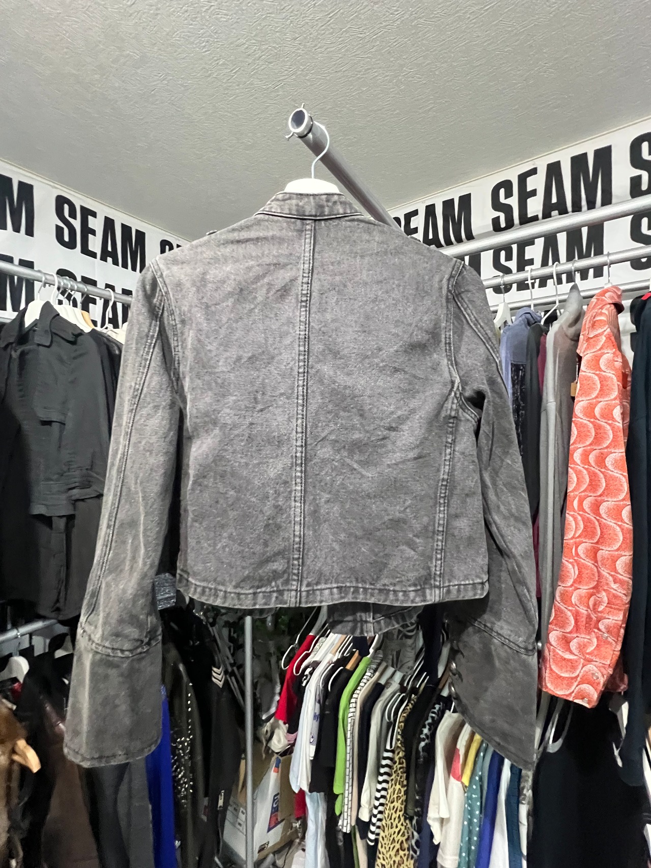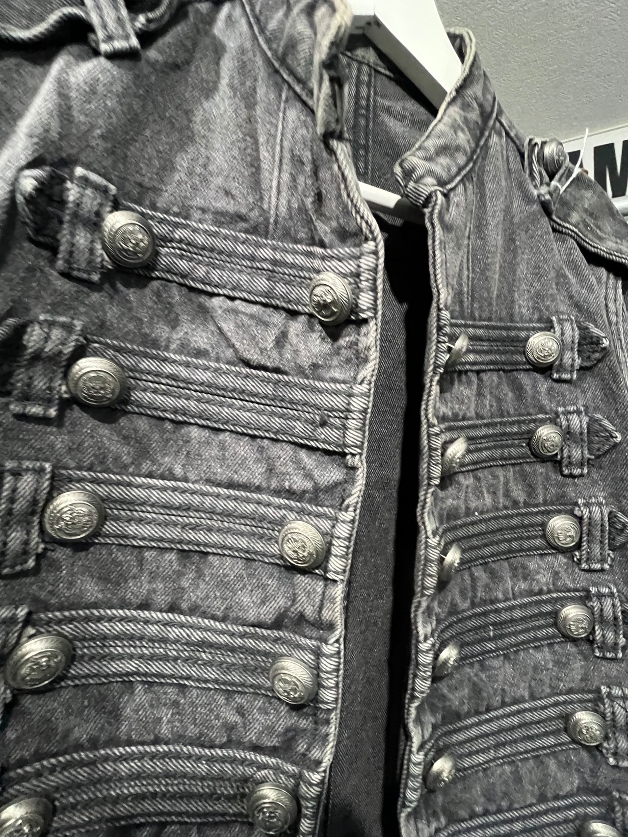 デニムのナポレオンジャケットです。見てわかる通り、短丈でめちゃくちゃかっこいいです。前のボタンは閉じません。上から二番目のボタンが欠損しております。